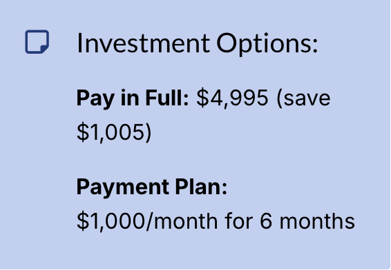 Your on-demand coaching and training hub packed with replays, smart docs, frameworks, and templates. This is your go-to community support to keep moving forward between calls, with resources designed to remove guesswork.