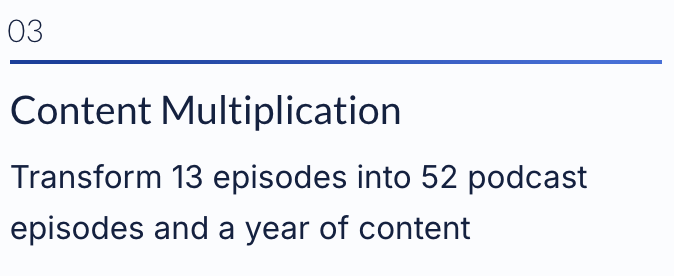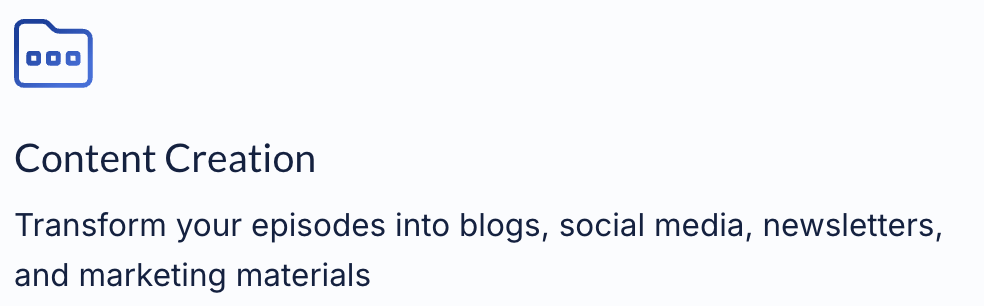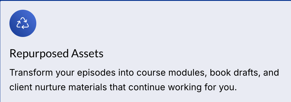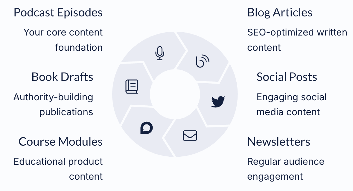Your podcast becomes the source material for blogs, social posts, newsletters, course modules, and even book drafts.