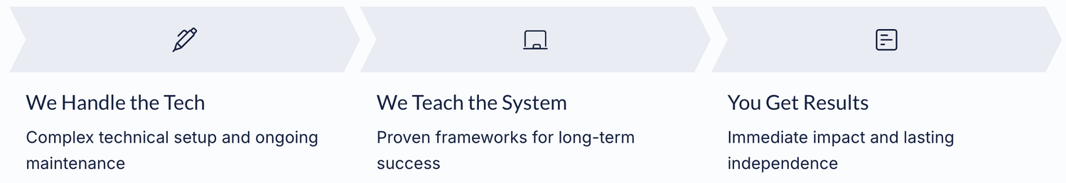 We handle the technical complexities while teaching you our proven system—giving you both immediate results and long-term independence.