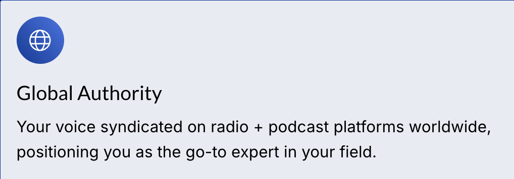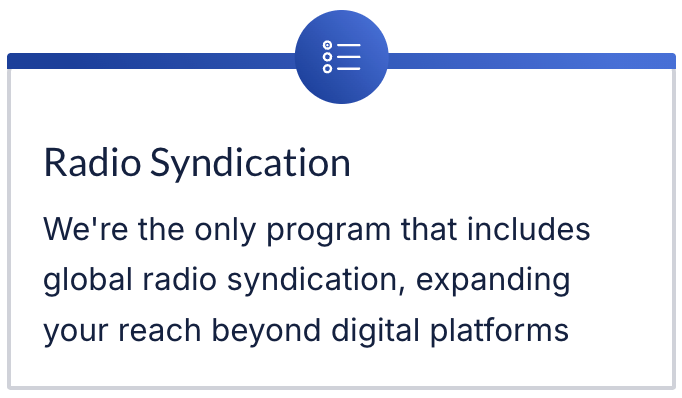 Unlike traditional podcasts that rely solely on digital platforms, our program includes global radio syndication—expanding your reach to audiences you'd never access otherwise.