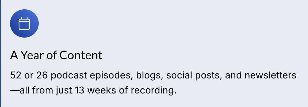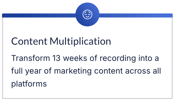 Transform your expertise into a year's worth of content that keeps working for you long after recording day.