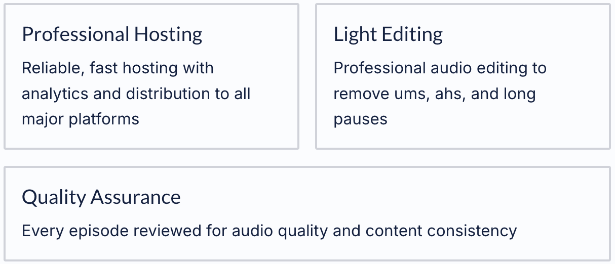 Every program includes professional podcasting hosting and light editing services, ensuring your content sounds polished and professional from day one.