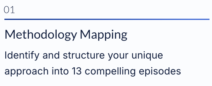 Record 13 weeks of solo episodes that showcase your methodology, transformed into 52 podcast episodes—a full year of content from just one season.
