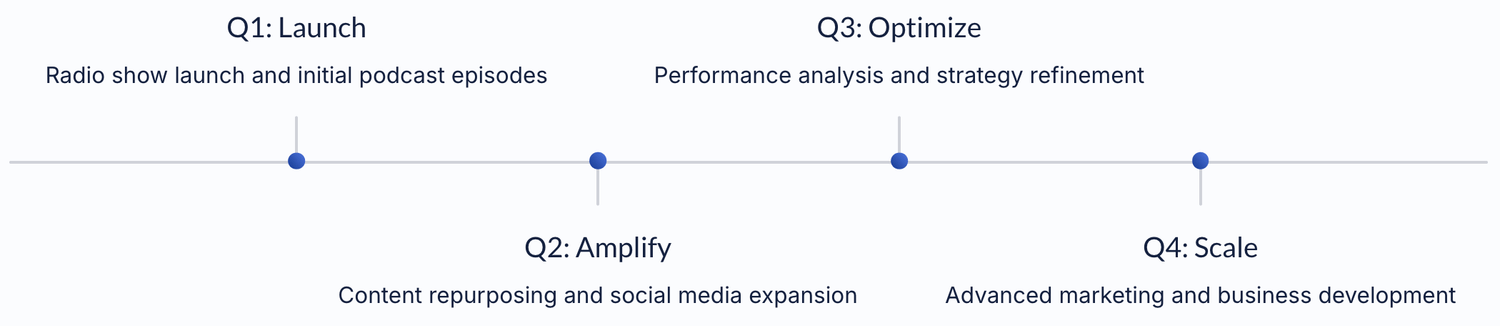 90 Days: Launch radio show (syndicated globally), cut episodes for podcast feed, optimize distribution across platforms